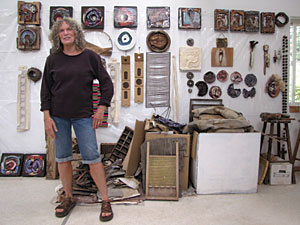 Kandinsky's approach to primitivism, which helped inspire him to turn inwards for imagery, has deeply affected Peggy Zehring. Her mixed-media art works begin with one step in journey of thought, meditation, finding the objects and inspiration and sketching the plan to be completed in one quick sweeping body movement application of materials. Her spontaneously but well thought out works, necessitate certain conditions to evolve in the manner they do. She, as Kandinsky before her, has a following of students who learn or as she says “teach her.”